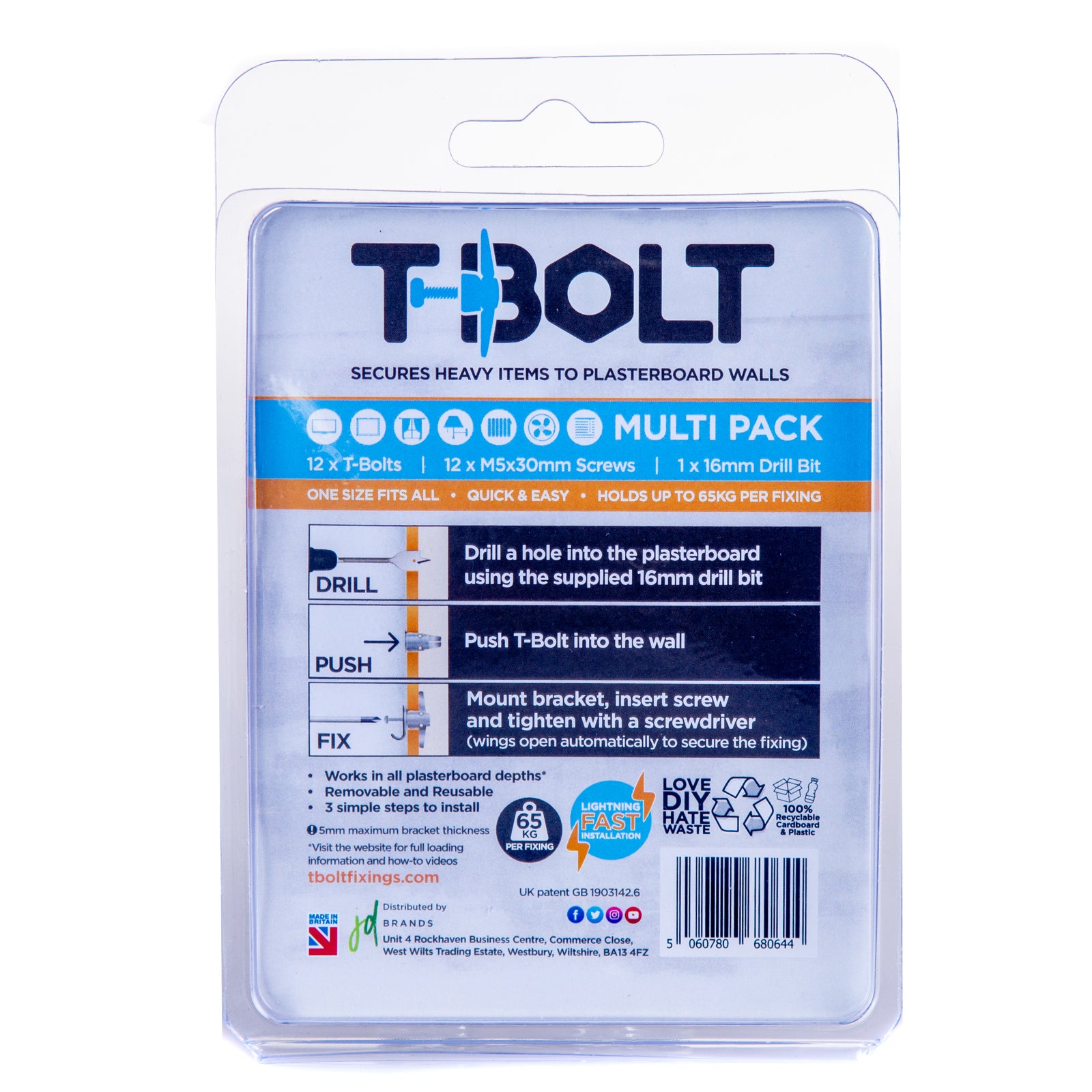 T-Bolt is a revolutionary new plasterboard fixing. Its straightforward & lightning fast to install, this fixing works in all depths of plasterboard. A unique depth washer ensures the fixing cannot be overtightened, and the automatic wing deployment gives peace of mind it is correctly fitted.